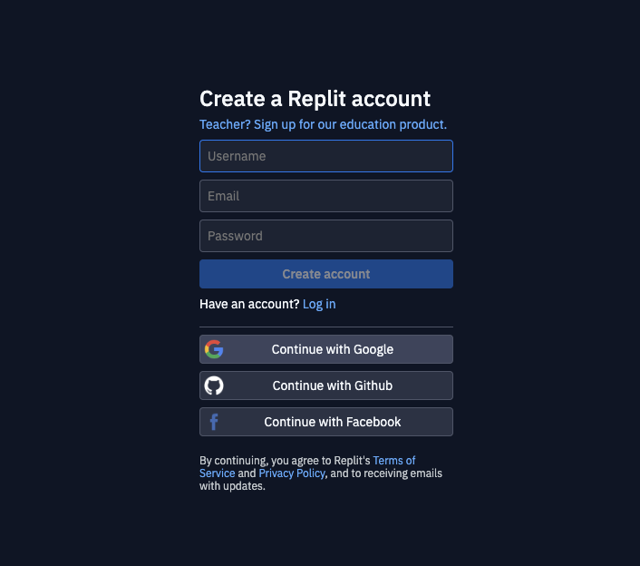 Greitam išbandymui puikiai tiks Replit įrankis. Atidarykite replit svetainę ir susikurkite naują paskyrą bei sukurkite pirmąją veikiančią programą – išspausdinančią ekrane žodžius “Hello World”