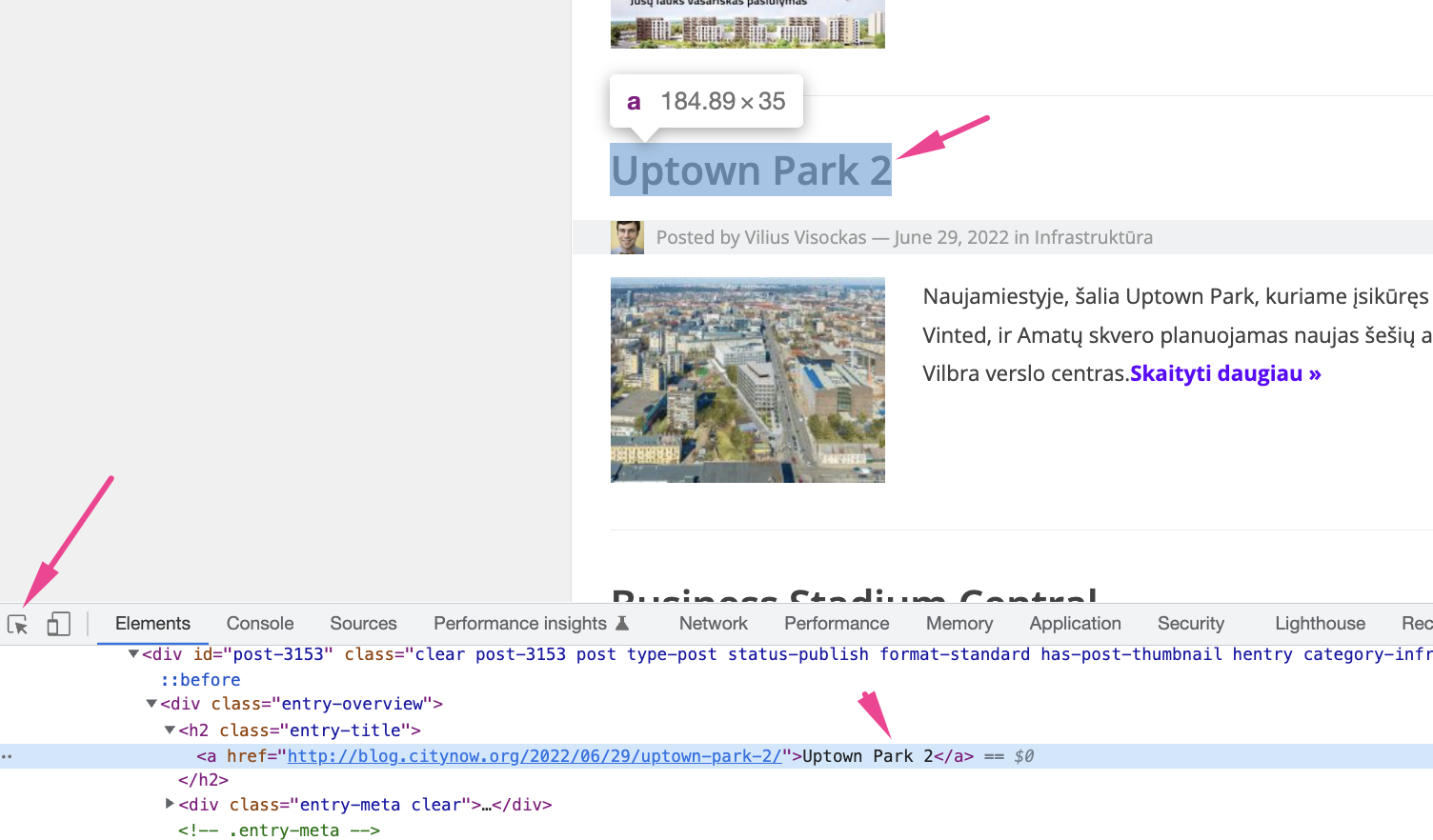 Kaip matome turime dvi kintamas dalis: geltonai pažymėta antraštė kurias norime paimti iš puslapio, o žaliai – nuoroda kur veda paspaudus ant antraštės (kuri šiai užduočiai neaktuali).