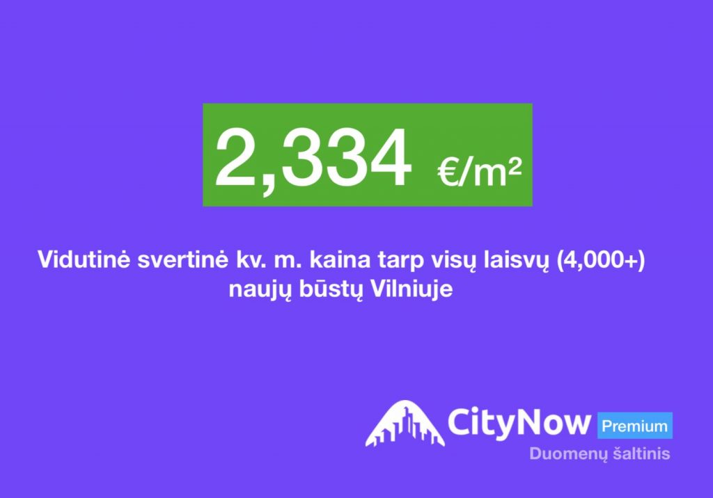 €2,334 už m2 – tokia yra vidutinė svertinė naujos statybų būsto kv. kaina Vilniaus mieste. Ši kaina gauta sumuojant visų laisvų butų kainas ir dalinant iš parduodamo ploto. Tokia metodika mano manymu yra logiška skaičiuojant vid. kainą, nes didesnis svoris suteikiamas didesnę rinkos dalį užimantiems projektams.