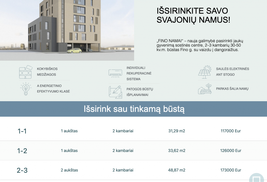 ('1-2', '1 auk\xc5\xa1tas', '2 kambariai', '33,62 m2', '126000 Eur', 'https://finonamai.lt/1aukstas-2butas/')